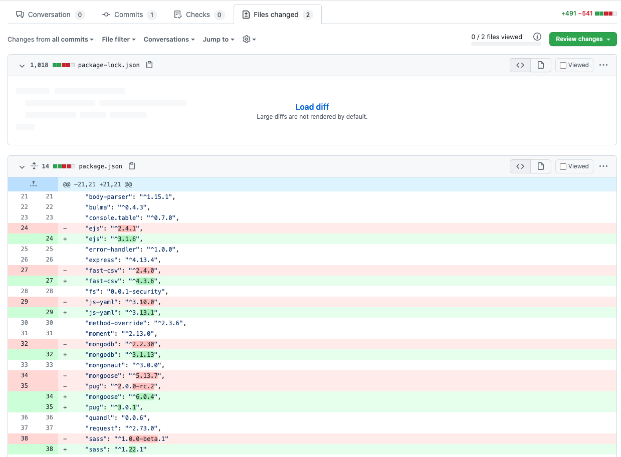 Here you can see a table generated by Snyk outlining explanations of which files suffered security vulnerabilities and came up with recommended fixes for these.