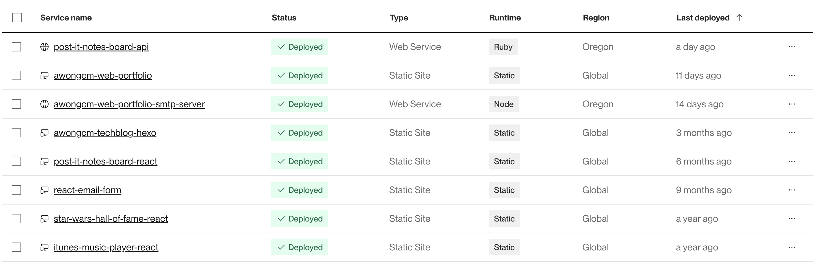 For my case, I had about 8 personal projects to migrate, 6 are static site (written in Javascript/React plus my tech blog written in Hexo framework and my web portfolio powered by Pug/CSS/Javascript), one Ruby on Rails API service and one NodeJS smtp service. Prior to the writing this, I found that I had to learn this concept from Render.com documentation pages about BluePrint yaml files. Fundamentally, they are just your IaC much akin similar to Ansible, AWS Cloudformation, Chef, Terraform etc, but are more simpler and easier to construct without having to memorise several configuration parameters at great length. See the upcoming notes on point 3.